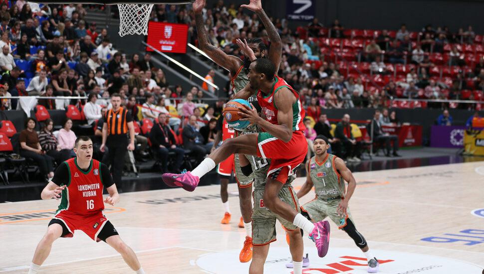 «Уралмаш» быстро набрал 5 очков подряд на старте 2-й четверти. А у «Локо», наоборот, долго не шёл мяч в корзину, пока Всеволод Ищенко здорово не разобрался с опекунами под кольцом. Тут же Мартин отыграл ещё 2 очка – и понеслась какая-то совсем бесшабашная игра, апофеозом которой можно считать вот этот неиспользованный выход троих игроков краснодарской команды на одного защитника.